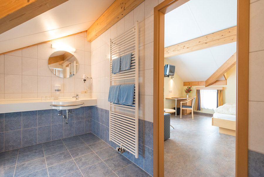 Jedes Standartzimmer enthält ein kleines Badezimmer mit Dusche und WC.